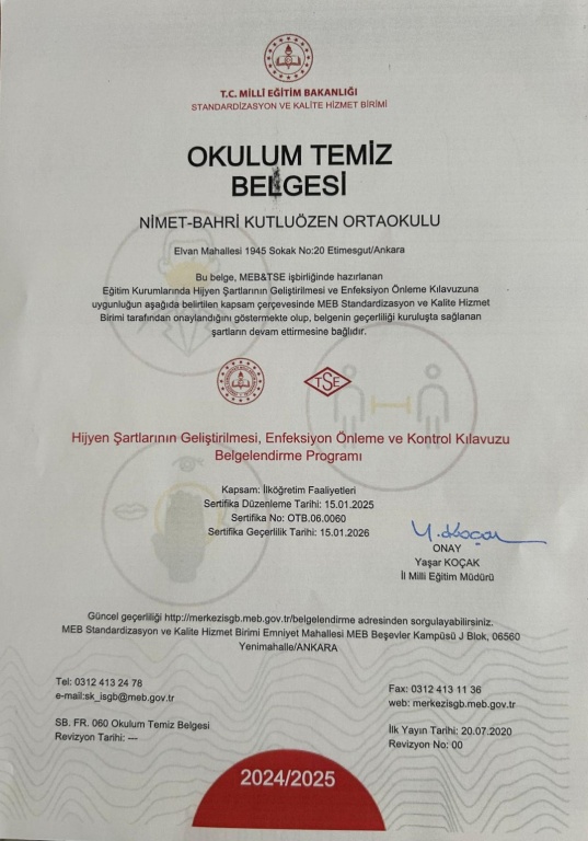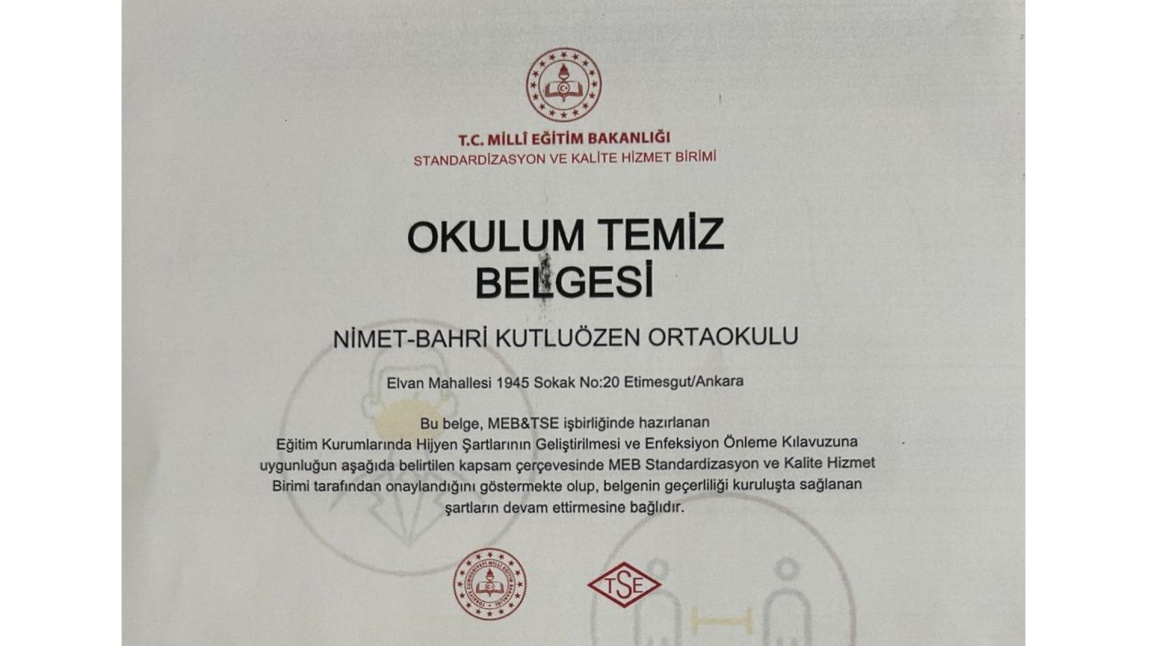 Okulumuz, öğrenci ve öğretmenlerimize sağlıklı ve hijyenik bir okul ortamı oluşturmak için "Eğitim Kurumlarında Hijyen Şartlarının Geliştirilmesi, Enfeksiyon Önleme ve Kontrol Kılavuzu"nda yer alan tüm kriterleri sağlayarak, yapılan denetimler sonucunda "Okulum Temiz Belgesi"ni almaya hak kazanmıştır.